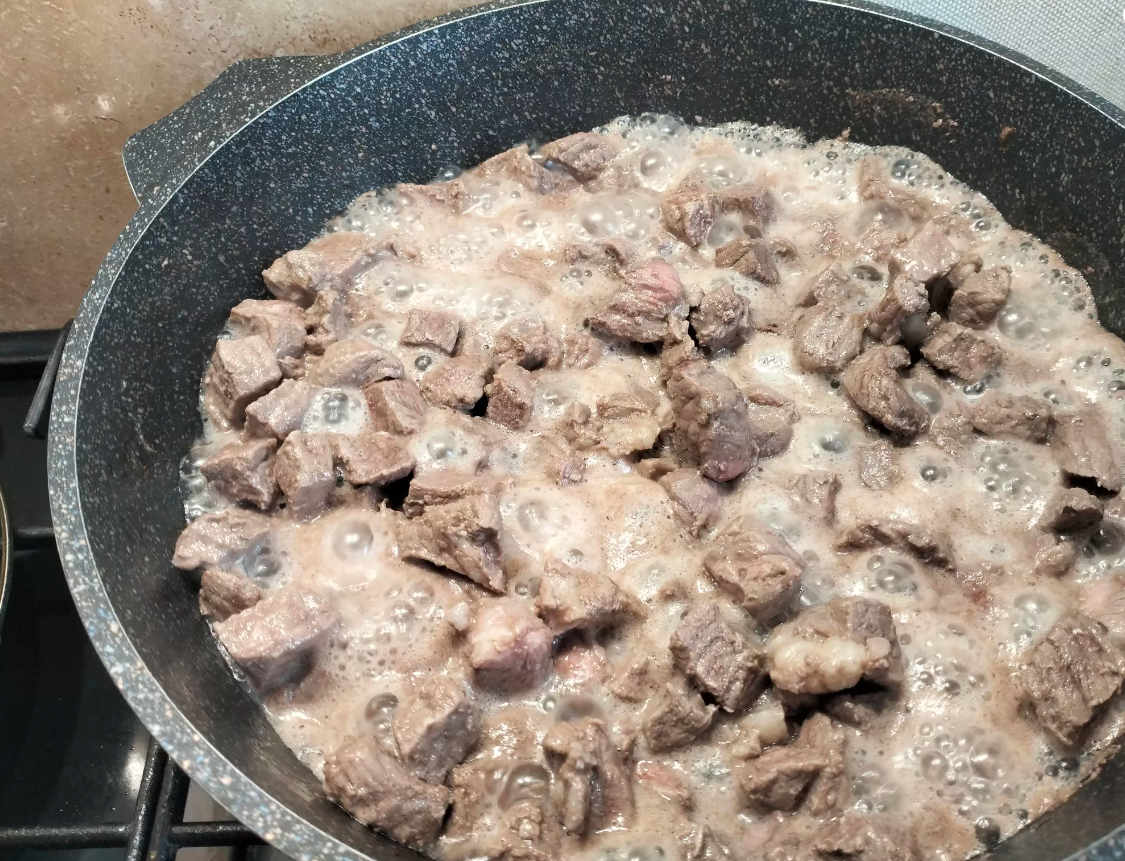 Влейте соус к мясу. Тушите на медленном огне до тех пор, пока мясо не станет мягким.
