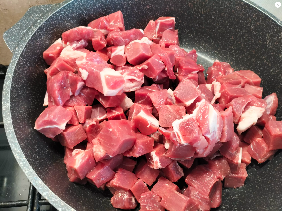 Говядину порежьте кусочками, обжарьте на сильном огне до образования золотистой корочки. Добавьте к мясу порезанный полукольцами лук.