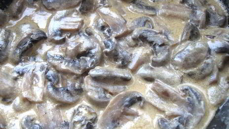 Пока мясо запекается, в сковороду, в котором жарилось мясо и остался его сок, положите шампиньоны и добавьте немного воды. Дайте ей немного выпариться, и влейте сливки. Поперчите и посолите по вкусу. Дайте соусу загустеть, готовьте его на медленном огне.
