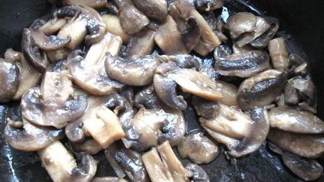 Порежьте шампиньоны и обжарьте их на сковороде, на сливочном масле. Не забудьте посолить и поперчить.